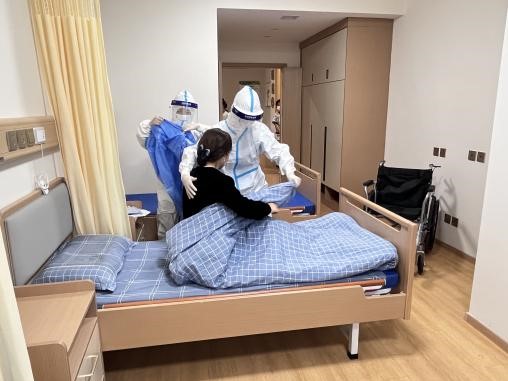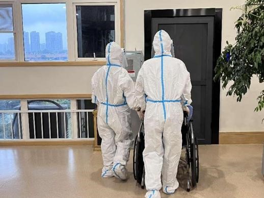5、護(hù)士及醫(yī)生做好防護(hù)進(jìn)入發(fā)熱長(zhǎng)者居室,幫助長(zhǎng)者穿戴隔離衣并佩戴口罩,通過(guò)隔離轉(zhuǎn)運(yùn)專用電梯,將發(fā)熱患者轉(zhuǎn)移至負(fù)壓救護(hù)車(chē)內(nèi);